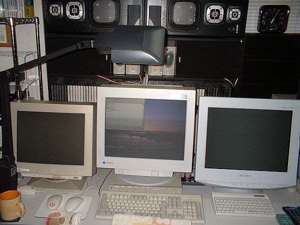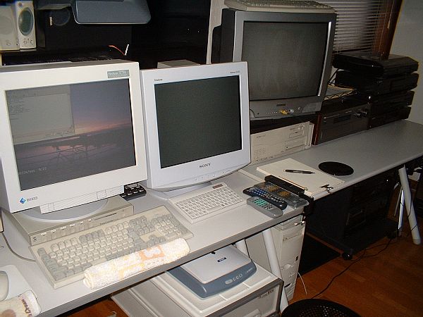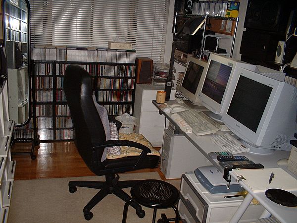 右が一度壊れ、ブラウン管全取っ換えで修理から戻ってきた19インチのSONY G420。中央が、SONYのが修理に行っている間にしかたなく買ったNANAOの19インチT731。左が永遠に壊れそうもないNANAOの大昔の17インチ。 モニターの背後は、MP3を聞くときに使っているSONYとYAMAHAのスピーカー(同時にガンガン鳴らしている)。細かいのは、オーディオ装置をパソコンで使えないときにしかたなく音だけだすための安物アクティブ小スピーカー群。 |
