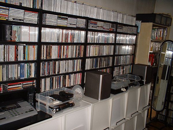 | 椅子の後ろ側。机のスピーカーに対するリアスピーカー。レコードボックスの上はCD。本はすぐに汚くなるし嵩張るので自分の部屋には置かない主義。基本的に読んだら捨てる主義。100円ショップで買った時計は、電池がみるみるなくなるのでかえって損しているような…。(^^;; |