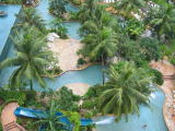 そうこうしていると、やっと雨の中、日本時間の13時20分頃グアムに到着。(グアム時間の14時20分時頃)多くの旅行会社が到着ロビーで待ち受ける中、アウトリガーの出迎えを探して空港の外にでるがいない。パパが到着ロビーに戻るとそこにいたらしい。すぐに見つけられなかったね。 アウトリガーへ行くのは私達だけだった。雨もほとんどやんでいたので、運転手に「Rainy Season?」と聞くと、「わからない」との答え(^^;) 「たまたま」とも言っていた(^^;) 実際今は雨季らしいんだけどね。 空港からタモンまでは3kmほど。しばらく走ると、小規模なハリウッド風の建物が見えてきた。どうやらグアムの中心地、Tumon(タモン)に着いたらしい。私たちが泊まるホテルもその中心地にある。