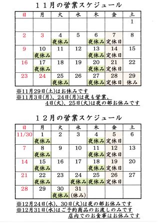 11月3日(月)、24日(月)は夜も営業、4日(火)、25日(火)は夜の部お休みです