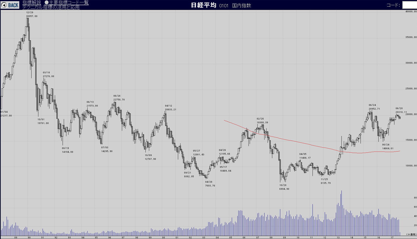 200月移動平均線はチャートの仕様上、バブル崩壊以降のすべての期間を表示できないが