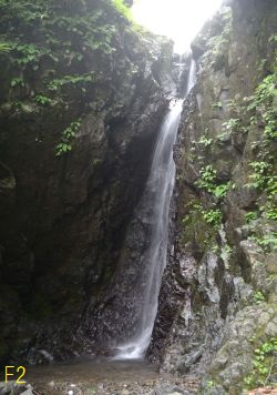 沢が狭くなり、小滝が見えてくると、やっとその上に立派なF2が現れた。2段-8Mの滝だ。