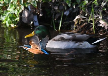 マガモと重なったカワセミ写真も撮れました。