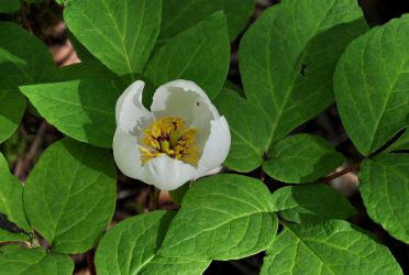 出会いまでどう行くか、林道を少し歩いて調査したところ、丁度ヤマシャクヤクの花が数株咲いている場所を見つけた。